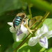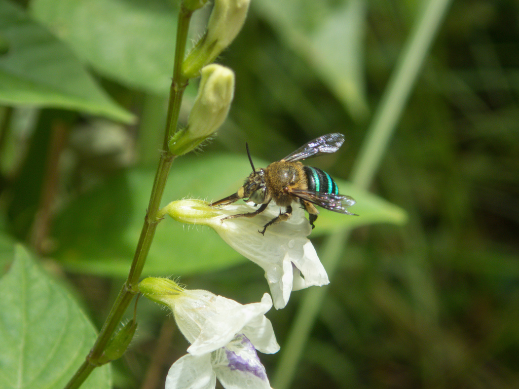 The bee is too large to enter the flower but pierces it to access the nectar, and probably not helping with pollination, as a result.